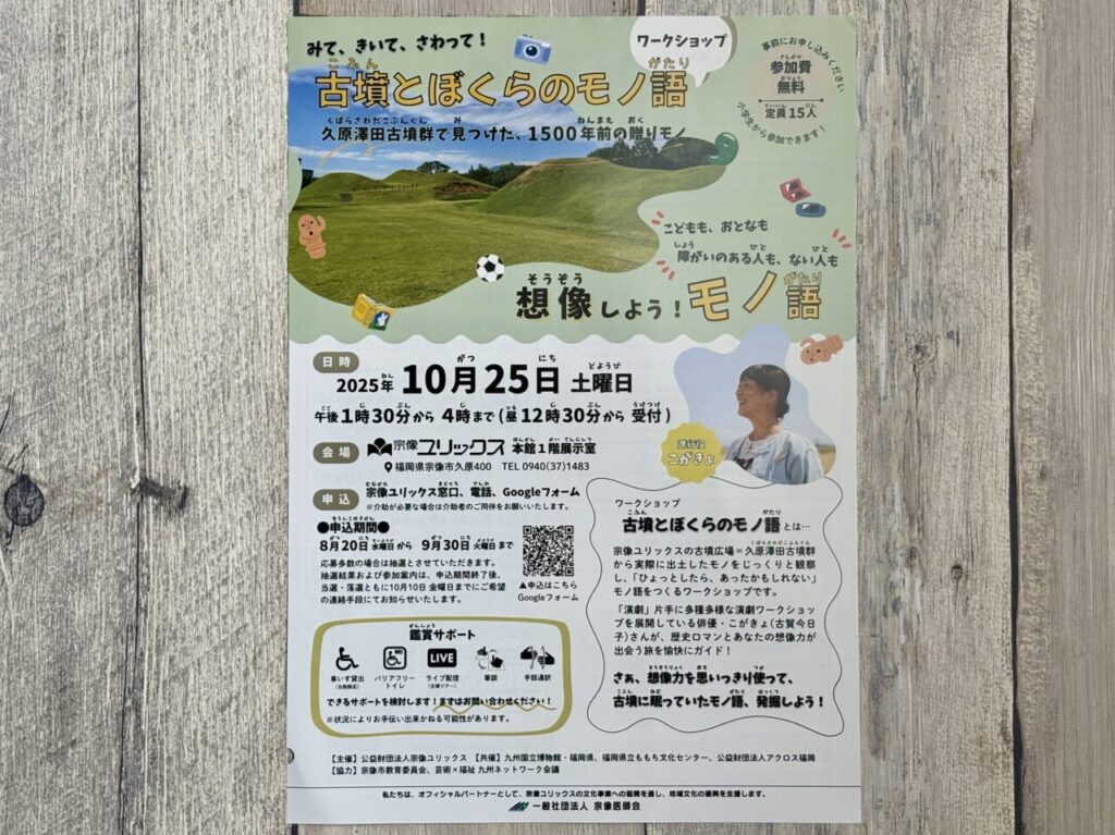 午前中は古代の髪型体験、午後は古墳の物語づくりと、一日を通して古代ロマンに触れ、楽しむことができそうですね。宗像の歴史を身近に感じられる特別なワークショップを体験してみてはいかがでしょうか。