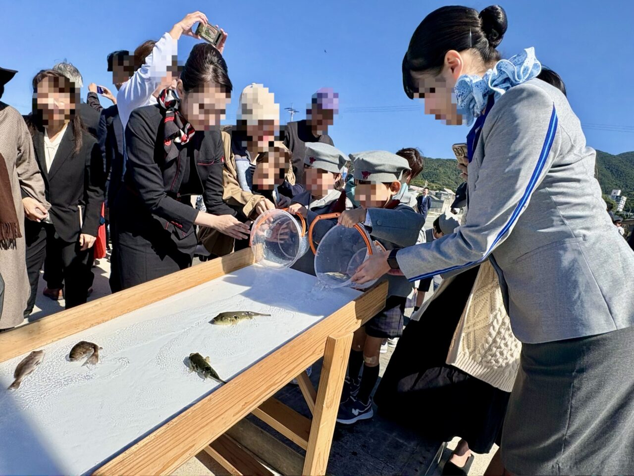 小さな手で一生懸命に放流する子どもたちの姿と、放流された稚魚が海で優雅に泳ぐ姿が印象的でした。