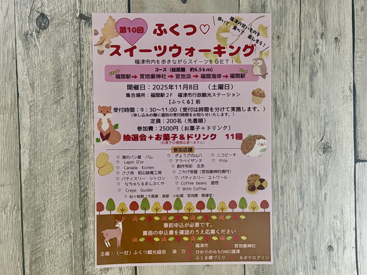 2025年11月8日(土)、福津市内で『第10回 ふくつ♡スイーツウォーキング』が開催されます。毎年大好評の人気イベントで、2025年度で10回目を迎えます。