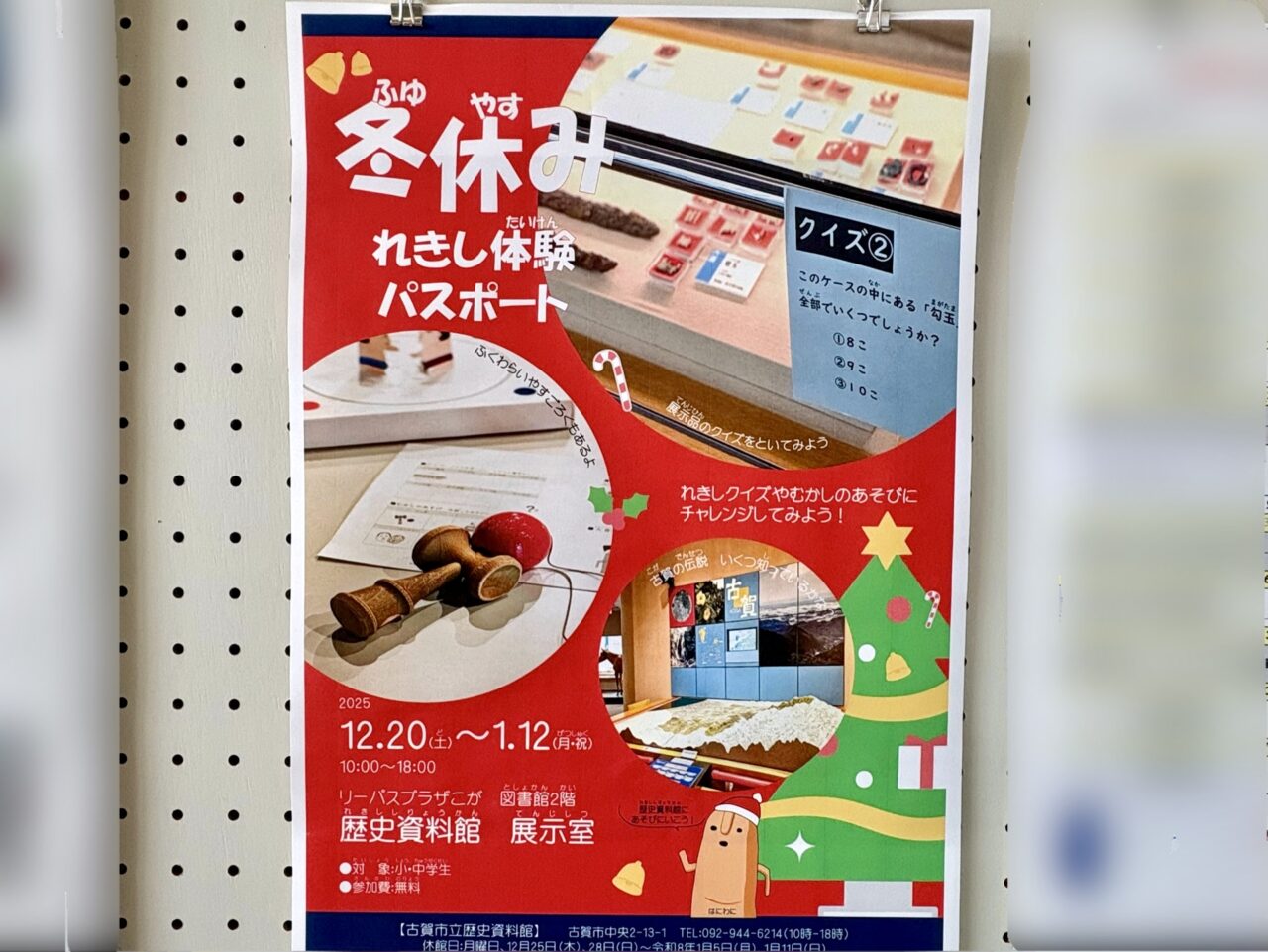 古賀市中央の「リーパスプラザこが(古賀市立図書館2階)」にある「古賀市立歴史資料館 展示室」にて、体験型イベント『冬休み れきし体験パスポート』が開催中です。(参加無料)
