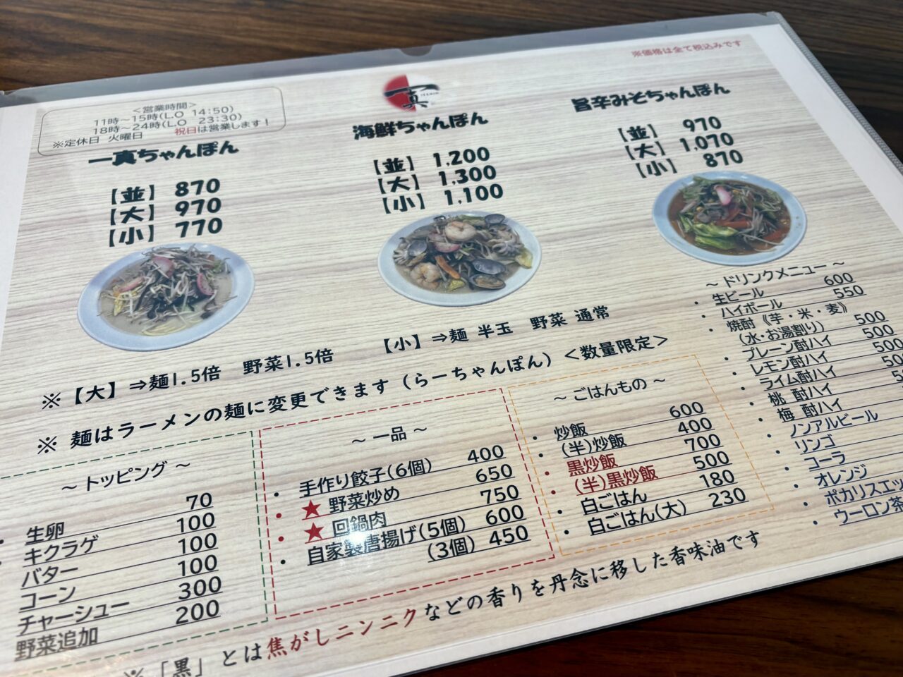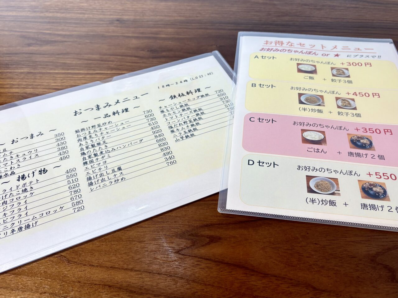 さらに、お好みのちゃんぽんに、ごはんやチャーハン、餃子、からあげなどがセットになったお得なメニューも用意されています。また、ディナータイムの18:00以降は、一品料理が充実しており、食事だけでなく「ちょい飲み」利用にも重宝しそうですよ。