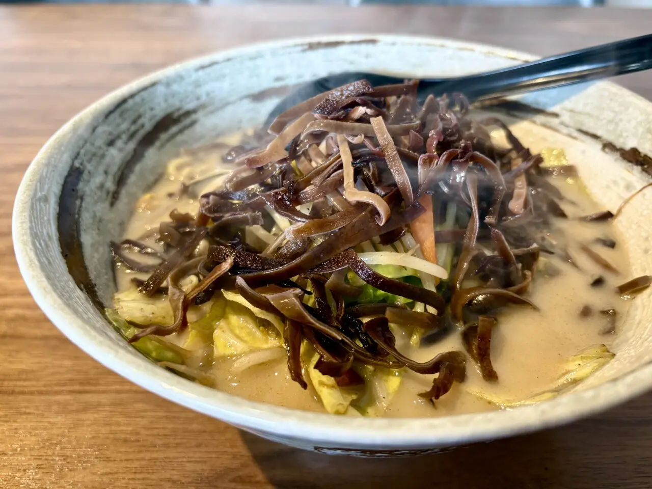 この日いただいたのは、「一真ちゃんぽん(小)」にきくらげをトッピングした一杯。運ばれてきたちゃんぽんは、香ばしく炒められた野菜と濃厚な豚骨スープの香りが立ち上り、トッピングしたきくらげがたっぷりとのった、食欲をそそるちゃんぽんでした。