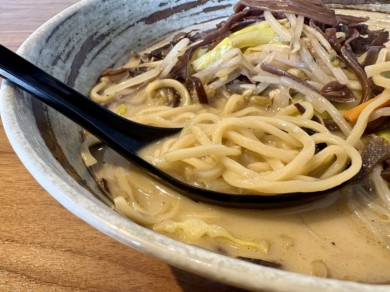 スープは豚骨ベース。炒めた野菜の香ばしさに、甘み・旨みが溶け込んだ、コクのある味わいに仕上がっています。濃厚な味わいながらも後味は重すぎず、とても美味しく頂きました。麺はちゃんぽんとしてはやや細めで、スープとの絡みも良好。食べやすさも魅力のひとつですね。