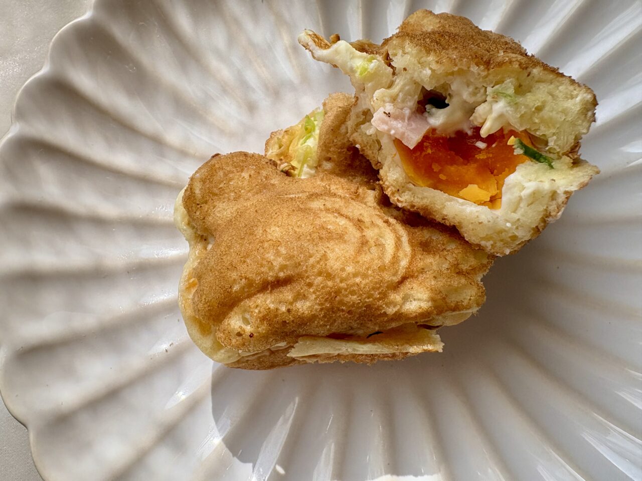 卵・ハム・キャベツ・マヨネーズが入ったボリュームのある一品で、ほんのり甘い生地と具材の塩気が絶妙にマッチ。一つひとつ丁寧に手作業で焼き上げられ、甘じょっぱさがクセになる、おやつにも軽食にもぴったりの一品。