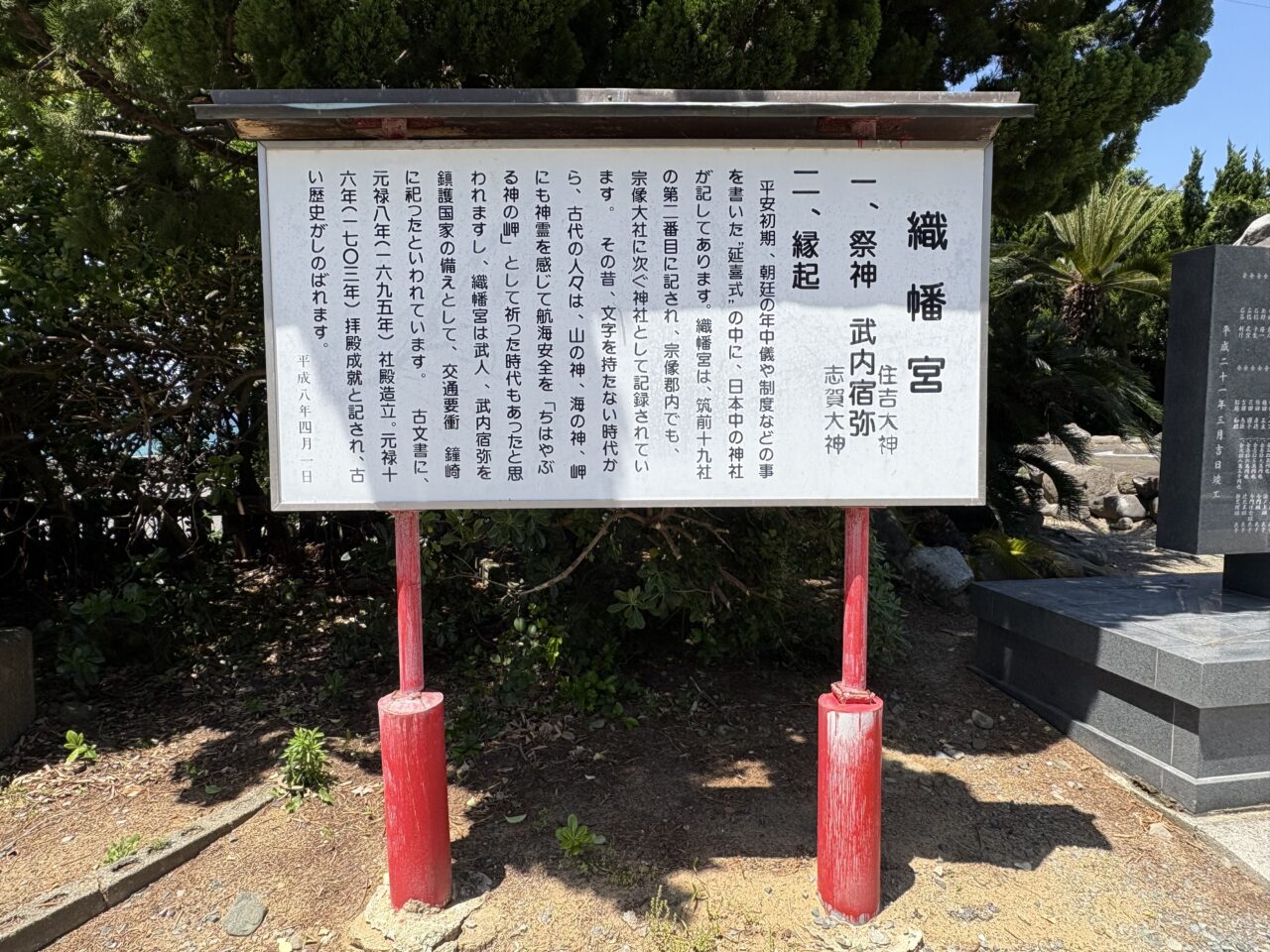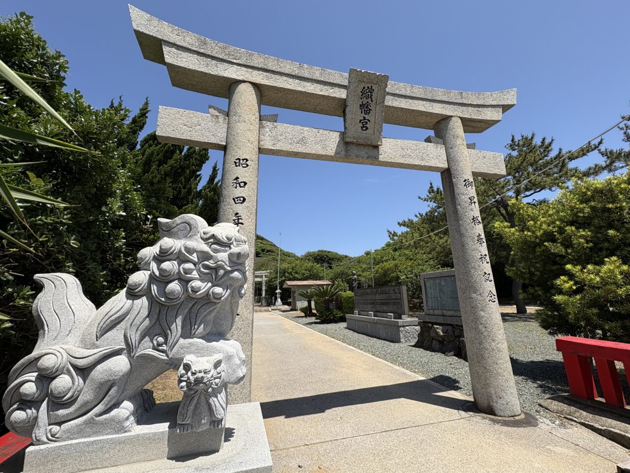 神社は漁師町として知られる鐘崎にあり、玄界灘の恵みを受ける鐘崎漁港のすぐ近くの岬に位置しています。神功皇后が三韓征伐の際、戦勝を祈願して紅白の旗を織ったことに由来し、「織幡神社」という名が付けられたと伝えられています。
