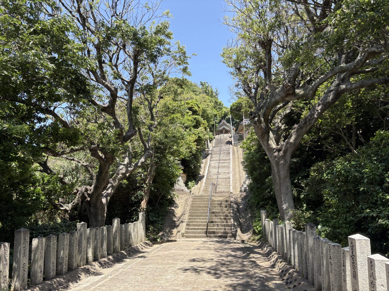 さらに、長い石段を登りきって振り返ると、鐘崎漁港を一望できる景色が広がります。
