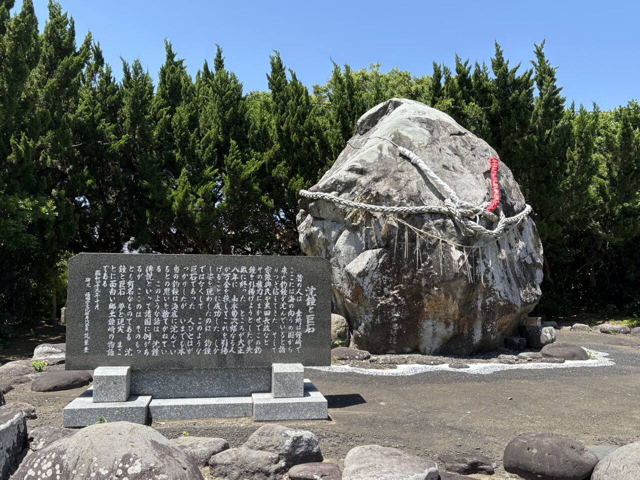 鳥居をくぐると、参道の脇に目を引く大きな石があります。この岬にはかつて「海に大きな釣鐘が沈んでいる」という言い伝えがあり、実際に引き上げてみると、それは釣鐘ではなく巨石だったそうです。現在、その“釣鐘と間違えられた石”が境内に置かれ、今も伝承を静かに伝えています。