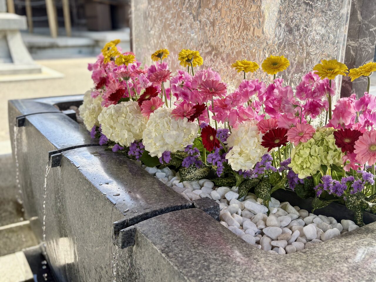 さらに、宮地嶽神社名物ともいえる手水舎には、スイートピーやガーベラなどの花々が飾られ、ひと足早く春の訪れを感じられる華やかな雰囲気に包まれていました。冬の空気の中、鮮やかな色彩で彩られ、訪れた方々が思わず足を止めて見入る姿もありました。