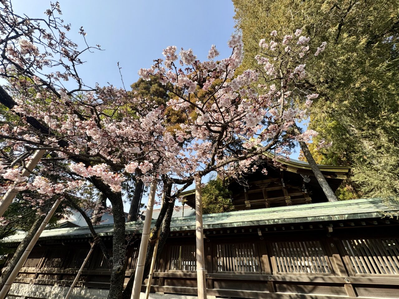 境内にはたくさんの桜が植えられていますが、その中でも御本殿横に立つ、樹齢約60年の大寒桜の『開運桜』は、最も早く花を咲かせることで知られています。