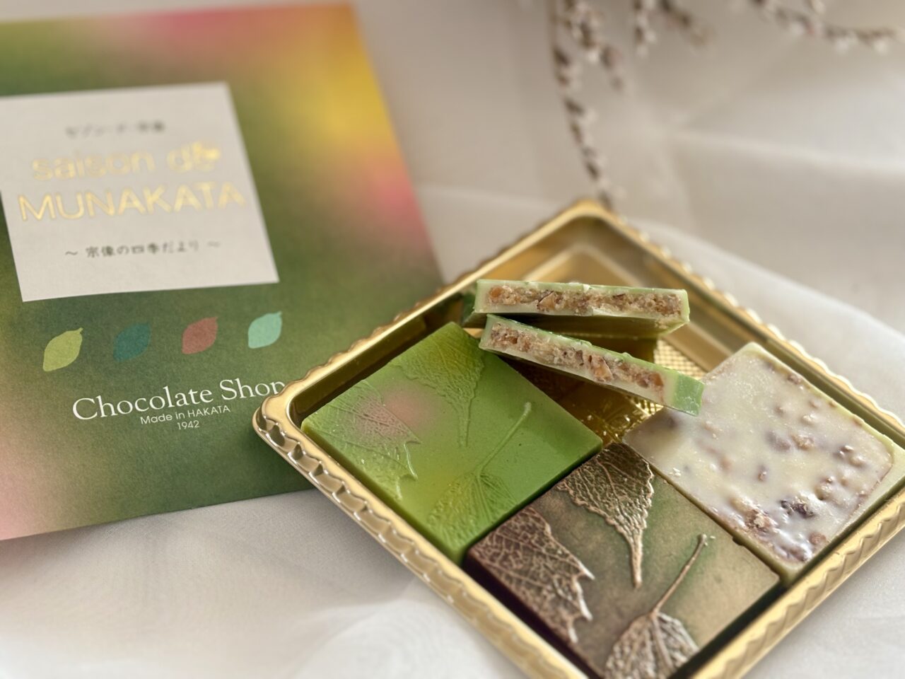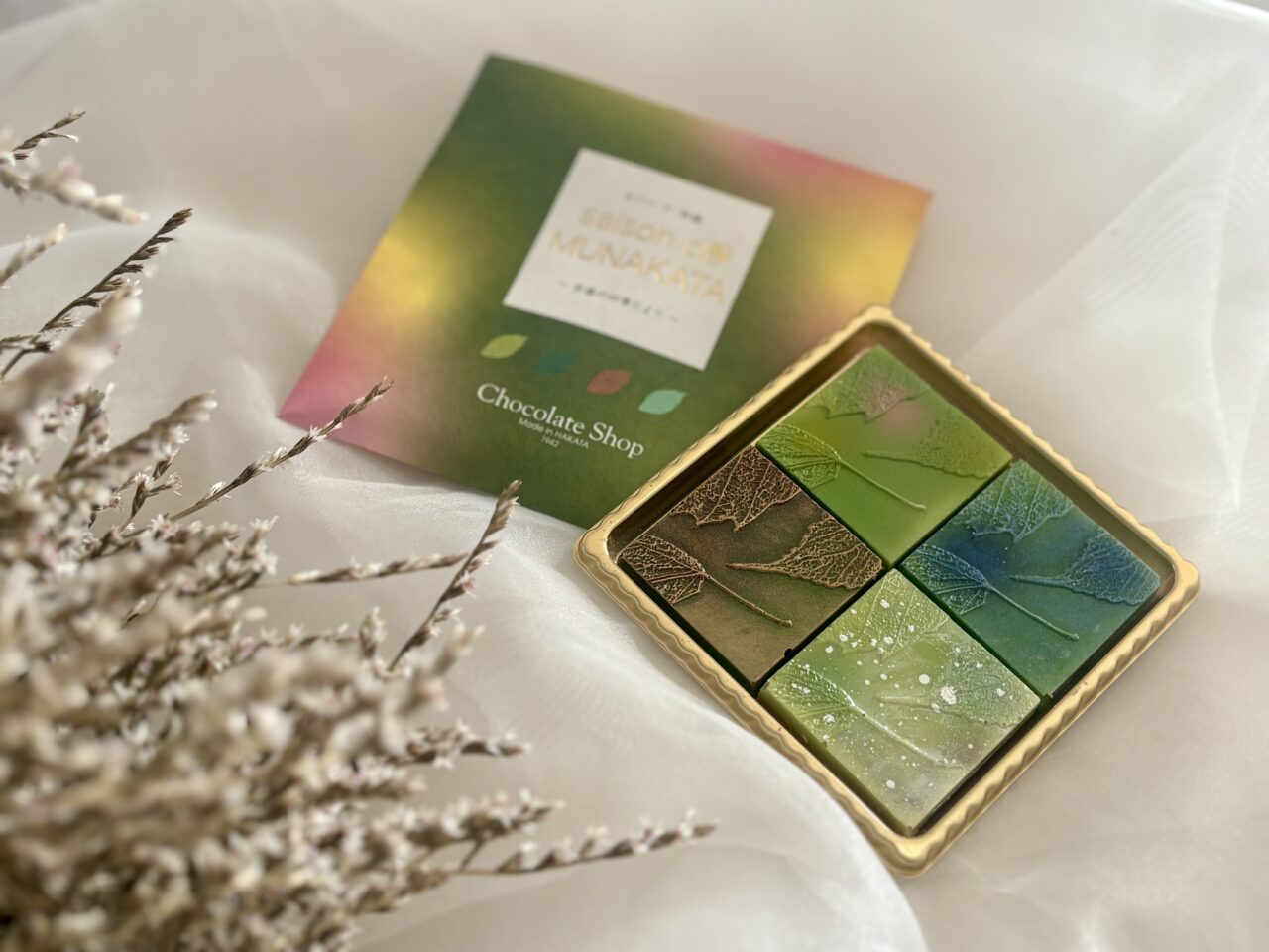 テーマは“宗像の四季”。春は「ほうれん草」、夏は「甘夏」、秋は「いちじく」、冬は「きなこ」の全4種類で、いずれも宗像産の素材が使われており、季節ごとの表情をショコラで表現した贅沢なセットとなっています。