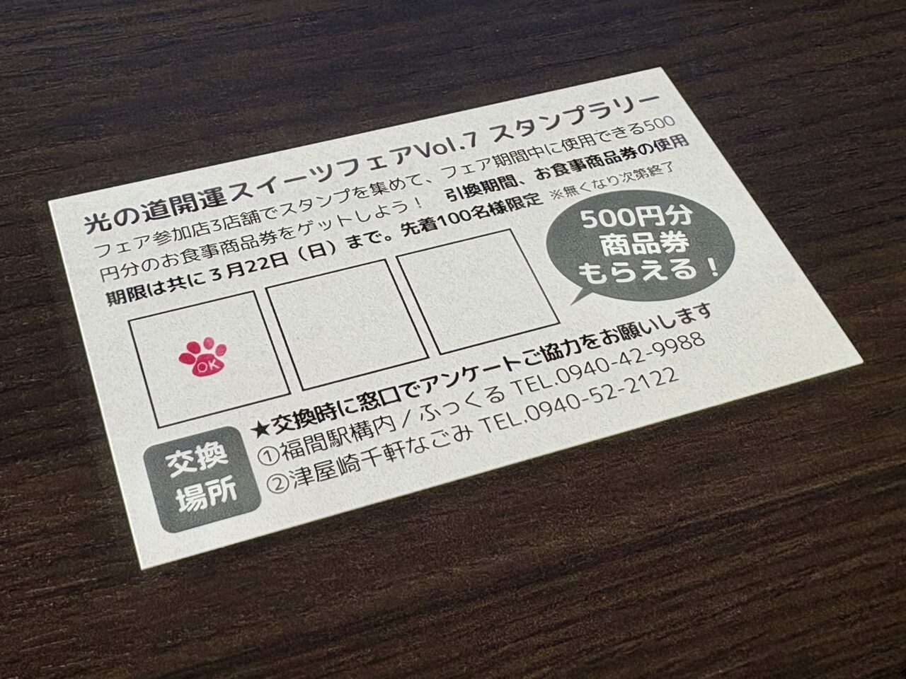 フェア期間中は、参加店舗3店のスタンプを集めると、先着100名限定で500円分のお食事商品券と交換できるスタンプラリーも同時開催中。光の道を楽しみながら、春の福津で苺スイーツ巡りをしてみてはいかがでしょうか。