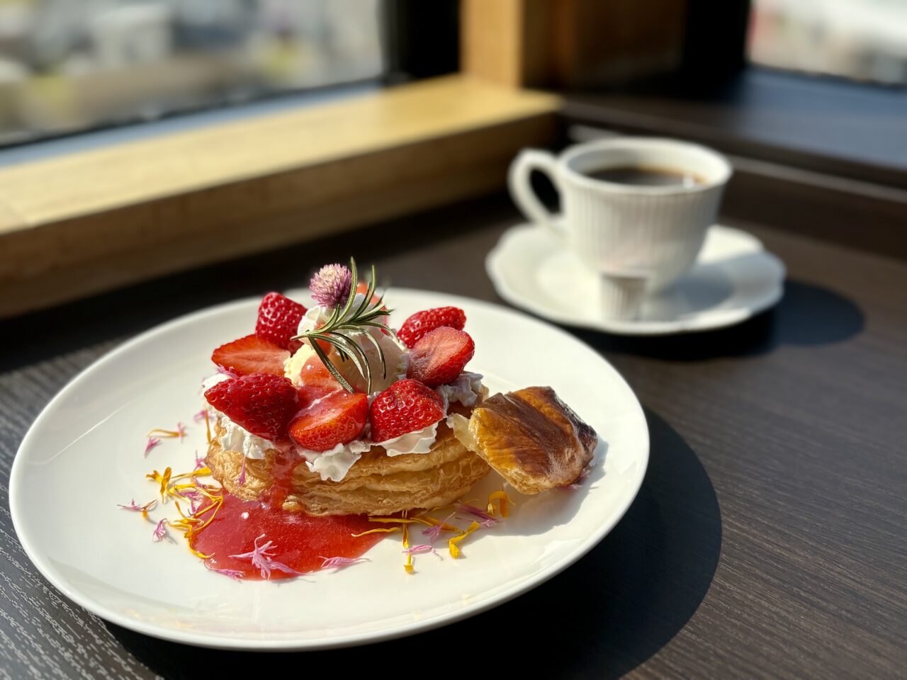 提供されている限定スイーツは、福岡を代表するブランド苺「あまおう」を100%使用した「光の道 あまおうミルクパイ」。焼きたてのパイ生地のサクサク感に、苺の甘酸っぱさ、バニラアイス、クリーム、苺ソースが絶妙に重なり合う一品です。千日紅とローズマリーなどで彩られた見た目も華やかで、まさに“開運”を感じさせる仕上がりとなっています。