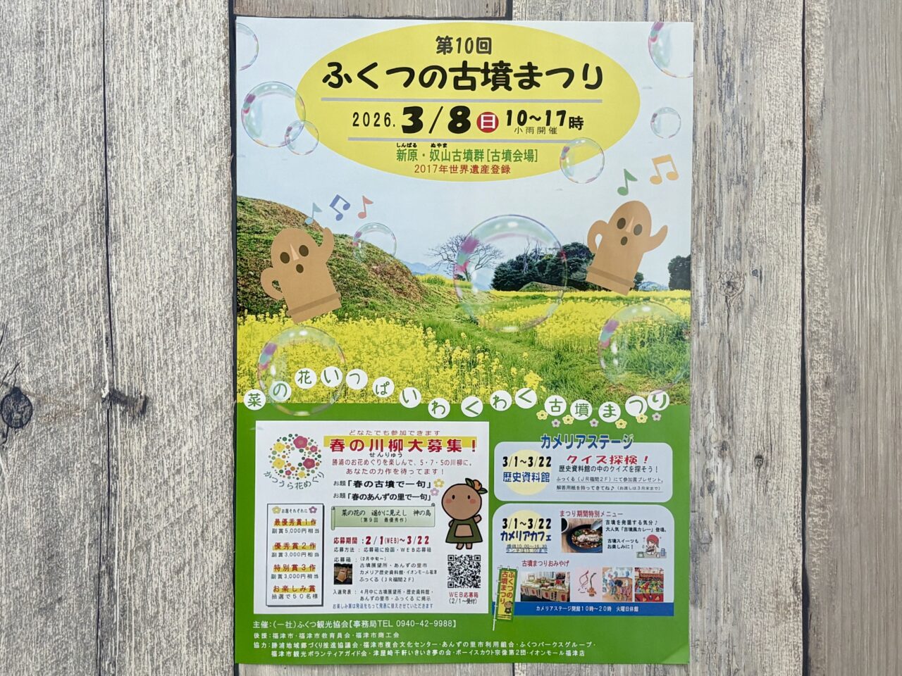 2026年3月8日(日)10:00~17:00、福津市勝浦の世界遺産 新原・奴山古墳群 にて『第10回 ふくつの古墳まつり』が開催されます。「新原・奴山古墳群(しんばる・ぬやまこふんぐん)」は2017年に世界遺産へ登録された地域で、古代の歴史を今に伝える貴重な文化遺産です。