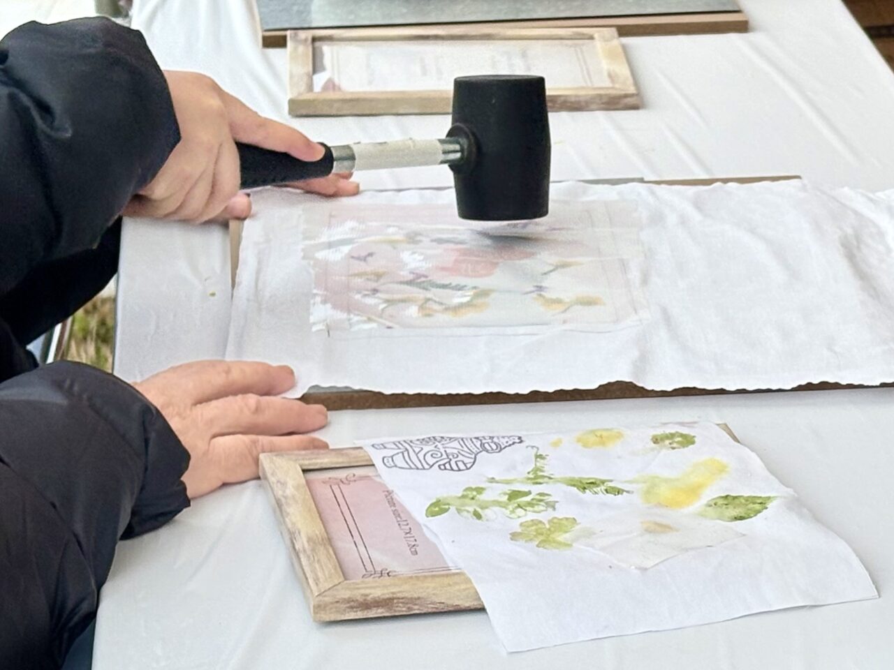 「春のたたき染め体験」では、菜の花を使った美しい黄色への染め上げの様子も見られました。