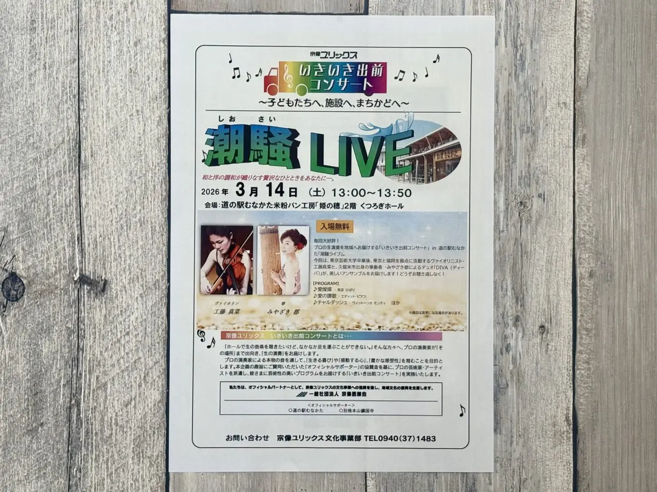 【宗像市】道の駅むなかたにて、ヴァイオリンと箏の美しいアンサンブルが楽しめる『潮騒LIVE』が3/14に開催されます。