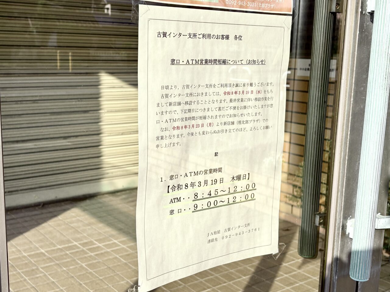古賀市内にあった、JA青柳支所と小野支所が統合され、新たに「古賀インター支店」という形で移転。小野支所は2025年10月10日(金)をもって閉店、青柳支所は 2026年3月19日(木)をもって閉店となっています。