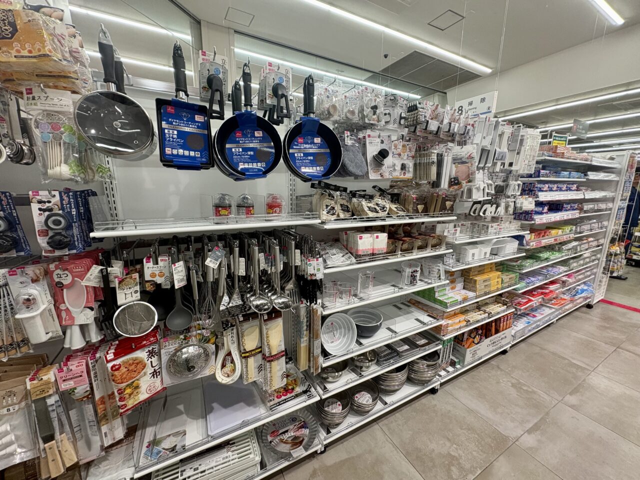 同店のダイソーは、近隣にある大型店舗「ダイソー古賀店」とは異なり、キッチン用品や日用品、文具など、取り扱い商品を厳選したコンパクトな売り場となっています。