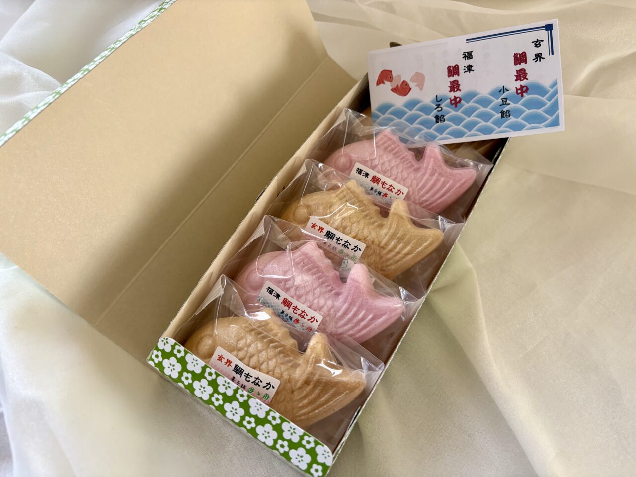 福津市は天然真鯛の漁獲量が県内でも有数の地域として知られており、その鯛をモチーフにしたこのもなかは、地域らしさを感じられる銘菓のひとつです。