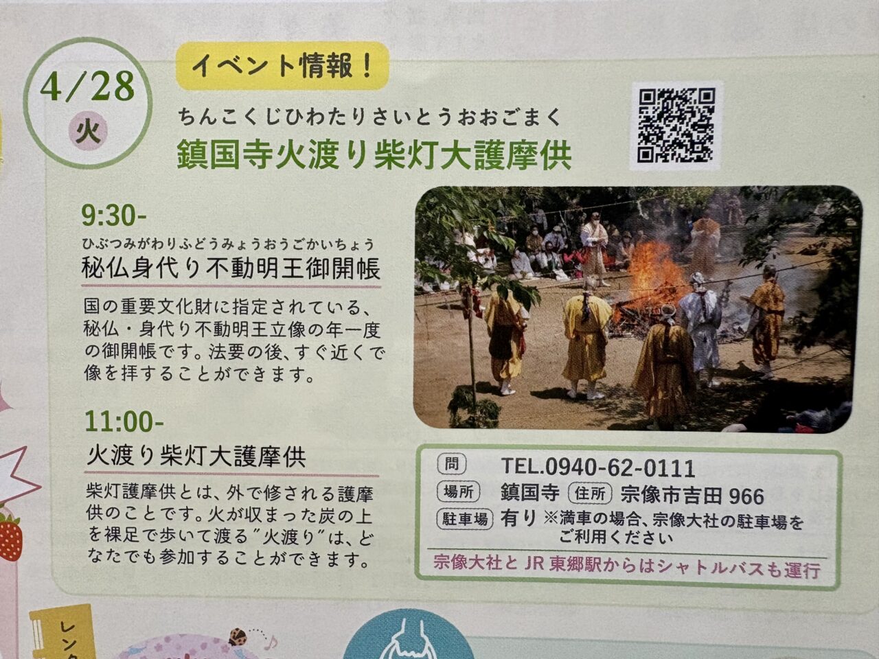 2026年4月28日(火)11:00より、宗像市吉田にある「鎮國寺」にて『火渡り柴灯大護摩供(ひわたりさいとうおおごまく)』が厳修されます。