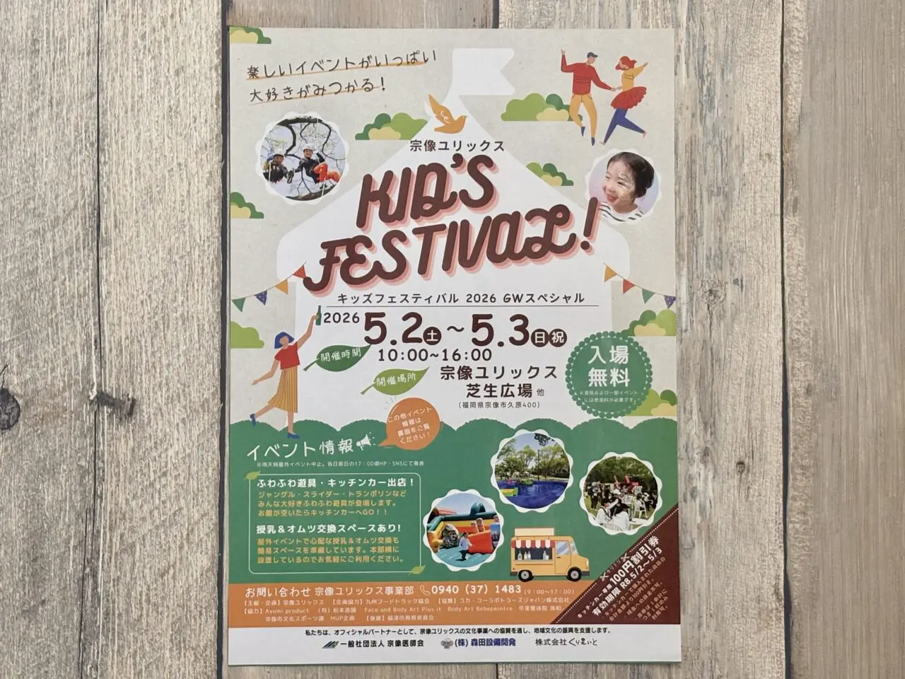 2026年5月2日(土)・3日(日・祝)の2日間、10:00~16:00まで、宗像市久原の「宗像ユリックス 芝生広場」にて『キッズフェスティバル 2026 GWスペシャル』が開催されます。入場は無料で、毎年ゴールデンウィーク恒例の人気イベントとなっています。